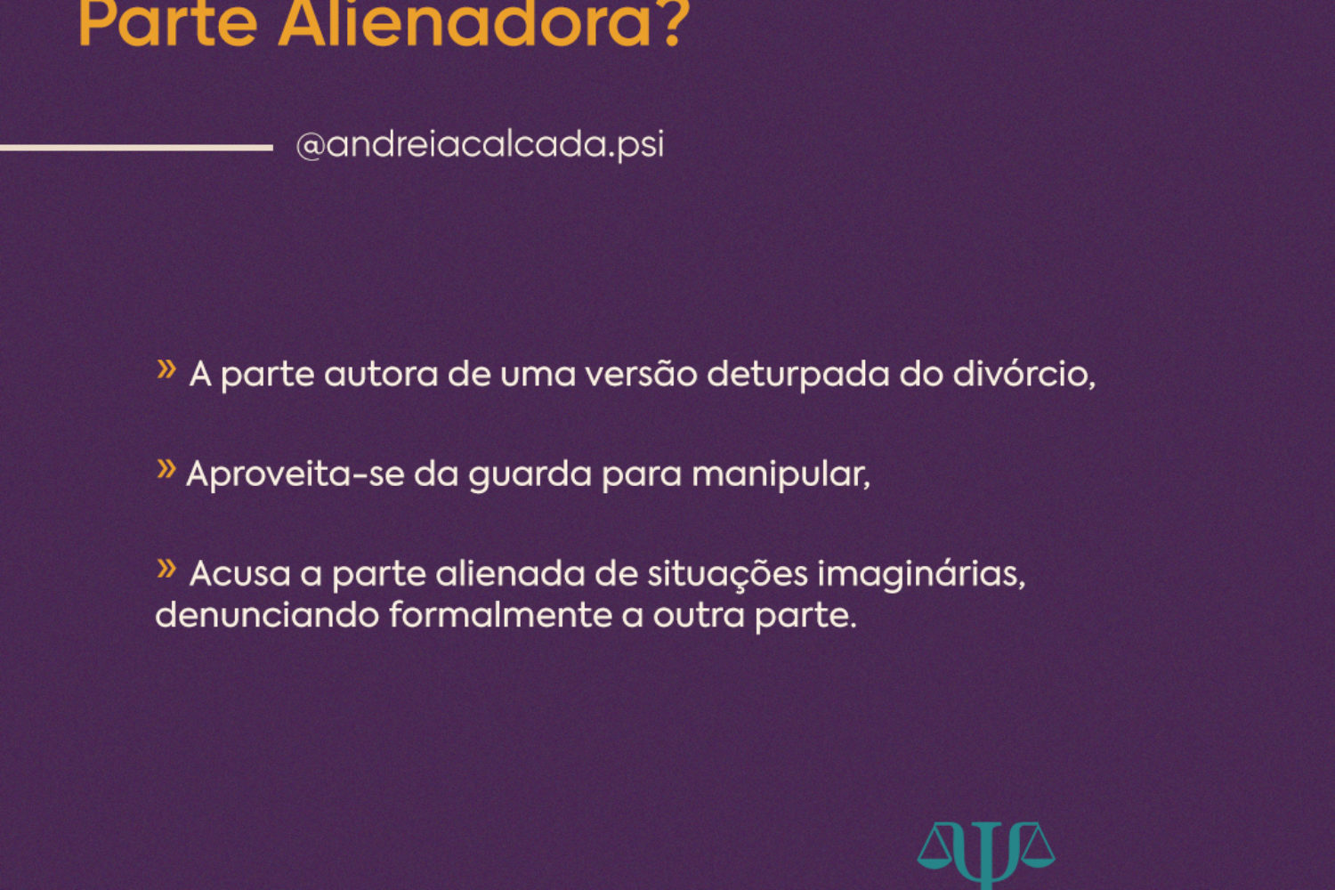 É autora de uma versão deturpada do divórcio, colocando-se como vítima e convencendo a criança ou adolescente de também serem a parte oprimida da relação.