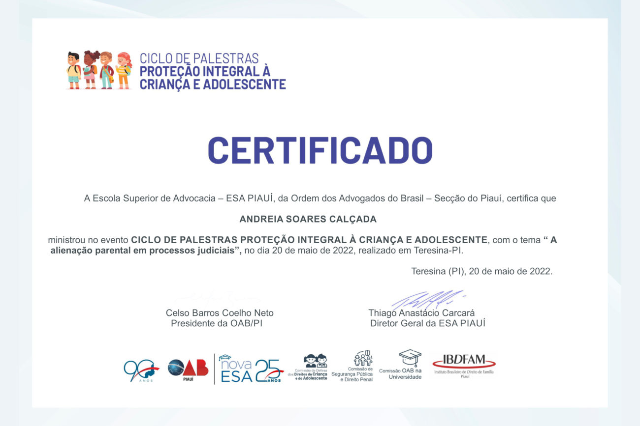 • Capacitadora no curso de Igualdade Parental para juízes, promotores, psicólogos e assistentes sociais de Pernambuco pela Escola de Magistratura de Pernambuco – 2014